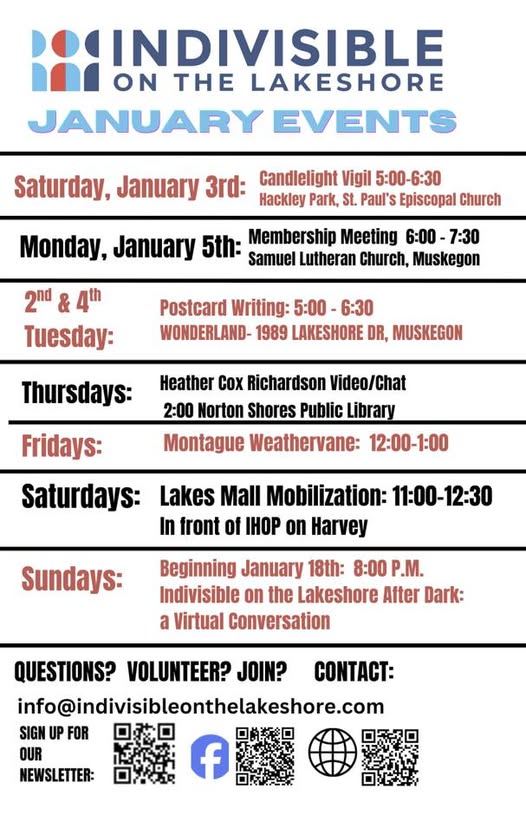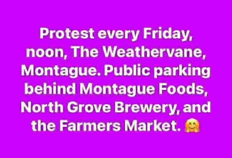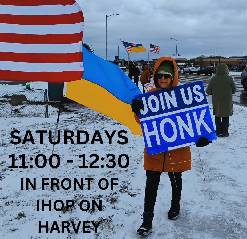 Half-hour protest during cold winter months, each Friday, noon, The World’s Largest Weathervane. Park in public lots, please. Write postcards to elected officials afterward at North Grove Brewery—we provide cards and stamps. Lunch is “Dutch-treat.” Aloha!🌴🏝️🌴Happy New Year of resistance!